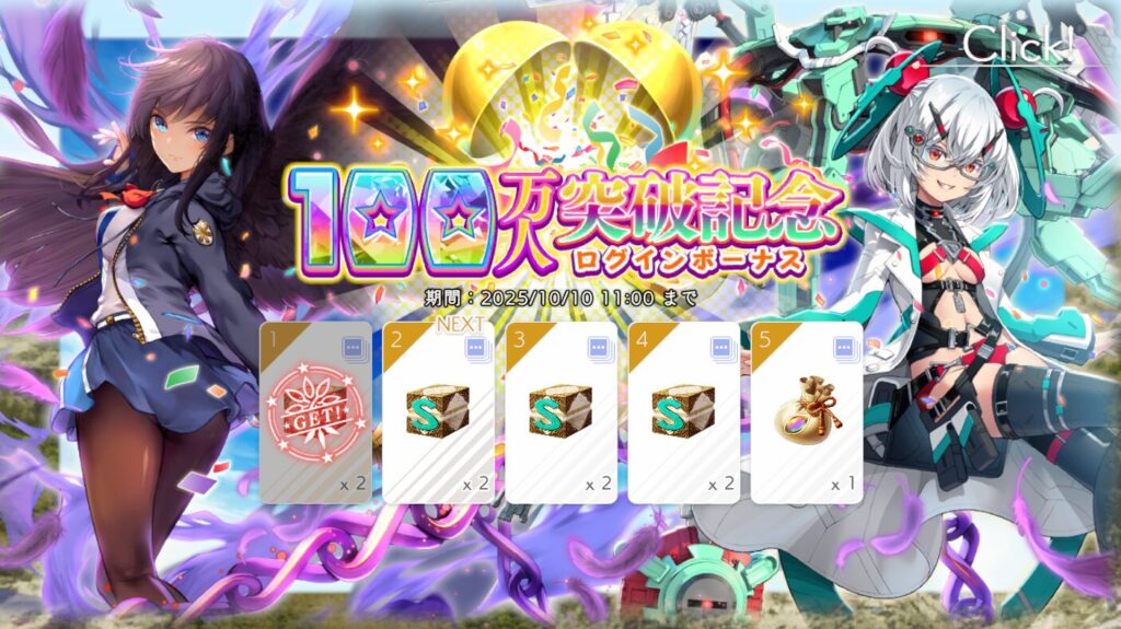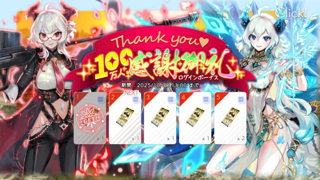 100万人突破記念ということで何か改善された為かと思い、今回久々にログインしましたが何も変わっておりませんでした。キャラが増えていたぐらいでした。
