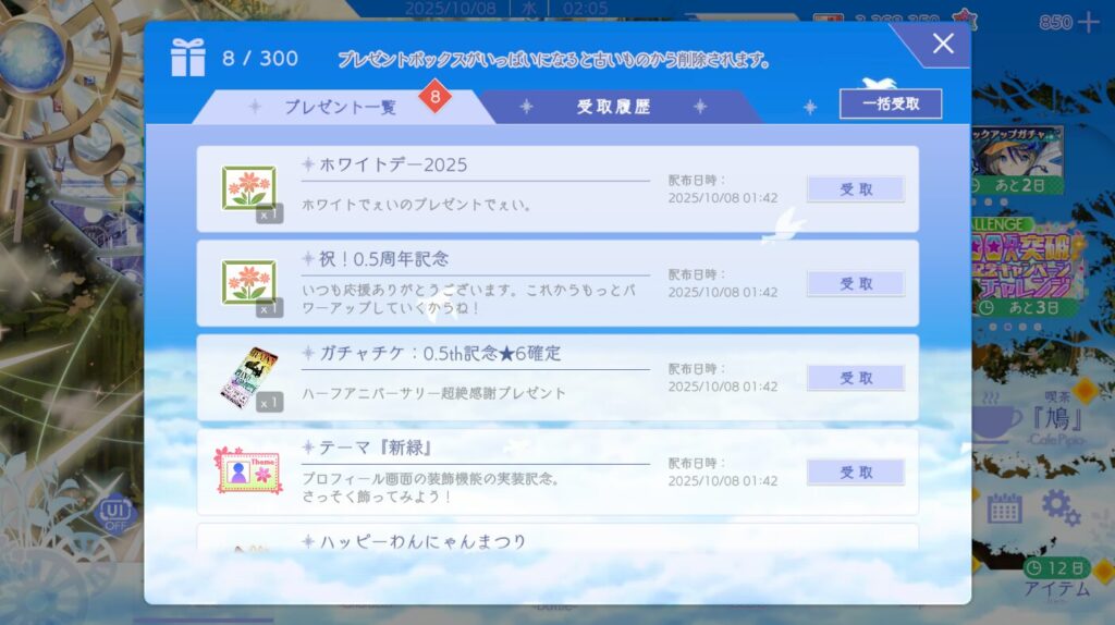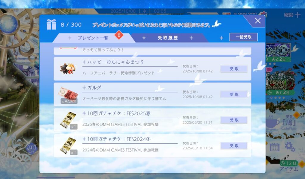 おまけに、「10回ガチャチケ:FES2024冬」の配布日時が「2025/03/10」て、遅っ。
