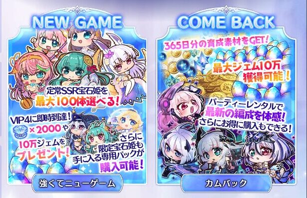 また、『強くてニューゲーム』用課金については、300円・100円・300円・610円・12,000円となっており、途中に『SSR宝石姫選択ボックス(6陣営)』10箱があります。
