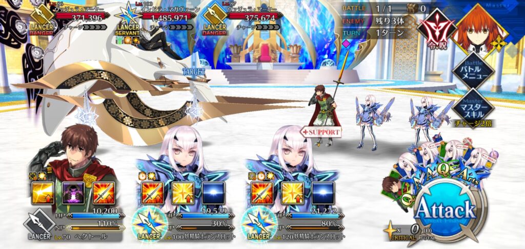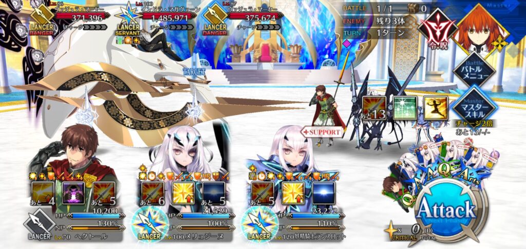 『Ⅵ 推奨Lv.100★★』のHPであればメリジューヌ単体宝具Lv.5+単体宝具Lv.3以上(ぐらい?)でヴァジュラを無視して差し切ることも可能かと思います。