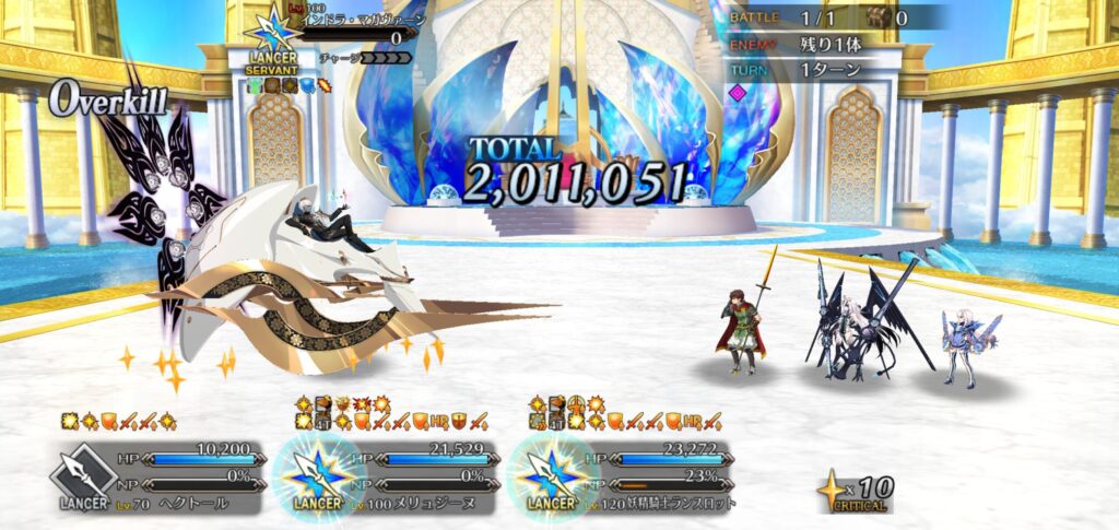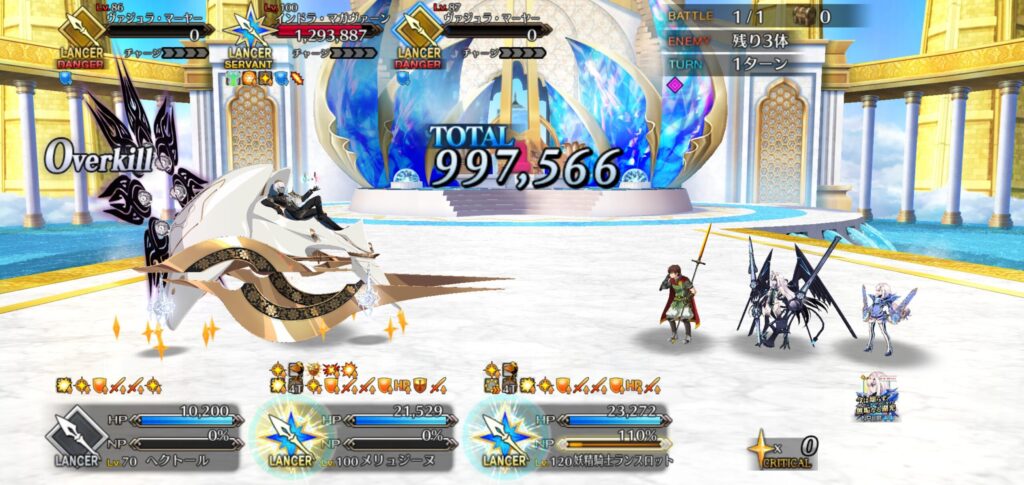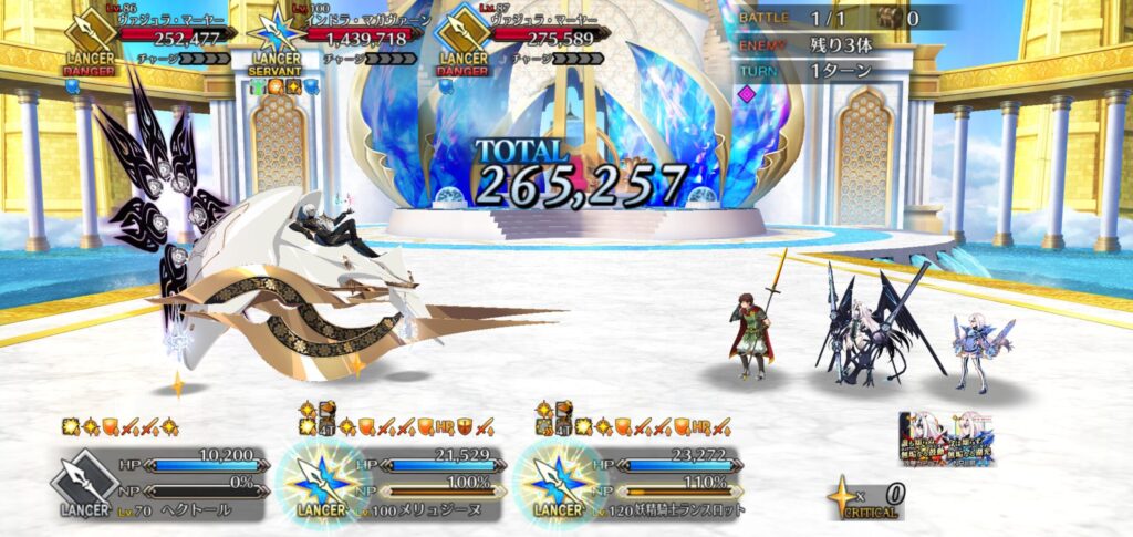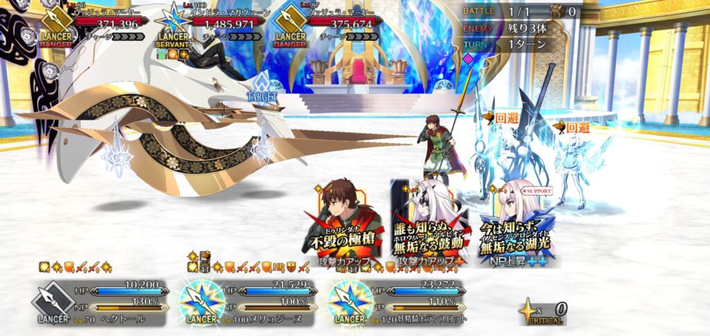 また、今回ランサーの一番のギミックとなっている2つのヴァジュラですが、全体宝具1回で消し飛ばせれば、残りの2体でそれなりに余裕を持って倒せます。