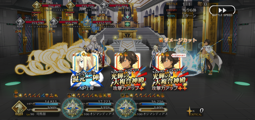 (ただし、1度目のオジマンディアスの宝具での防御減が確率でガードされたらHPが残る場合がある。)