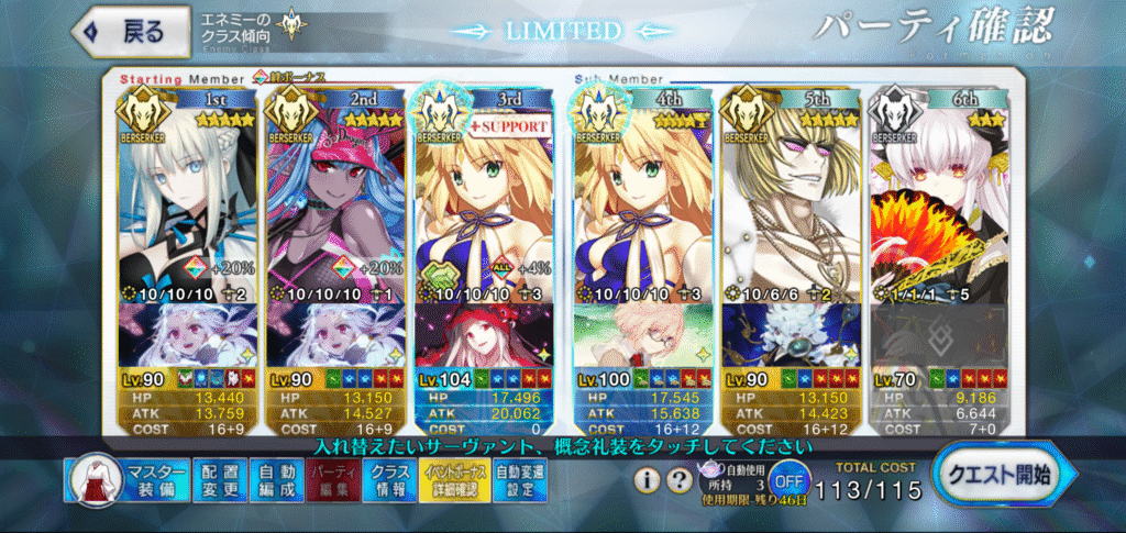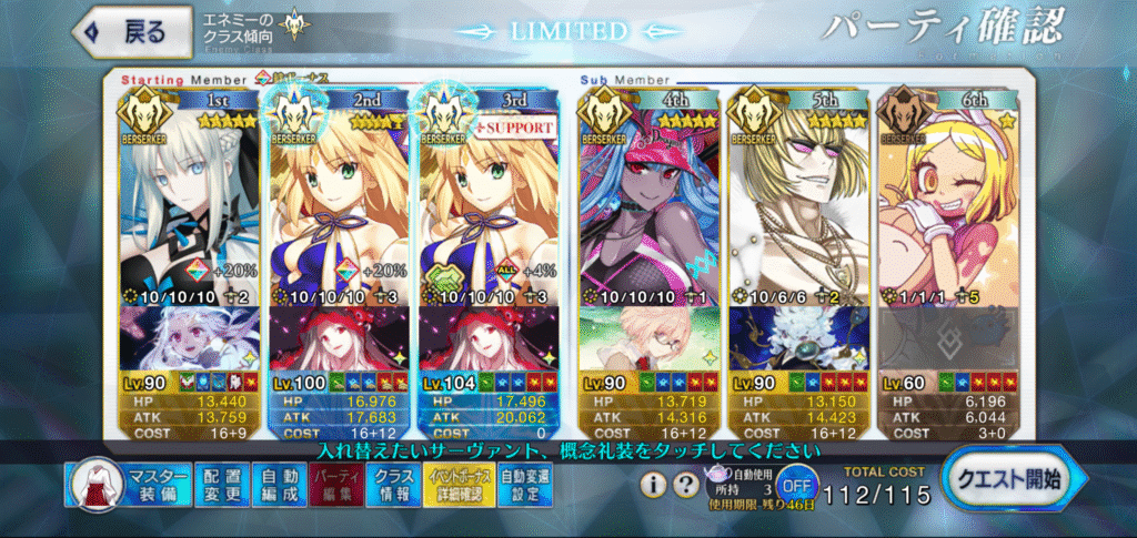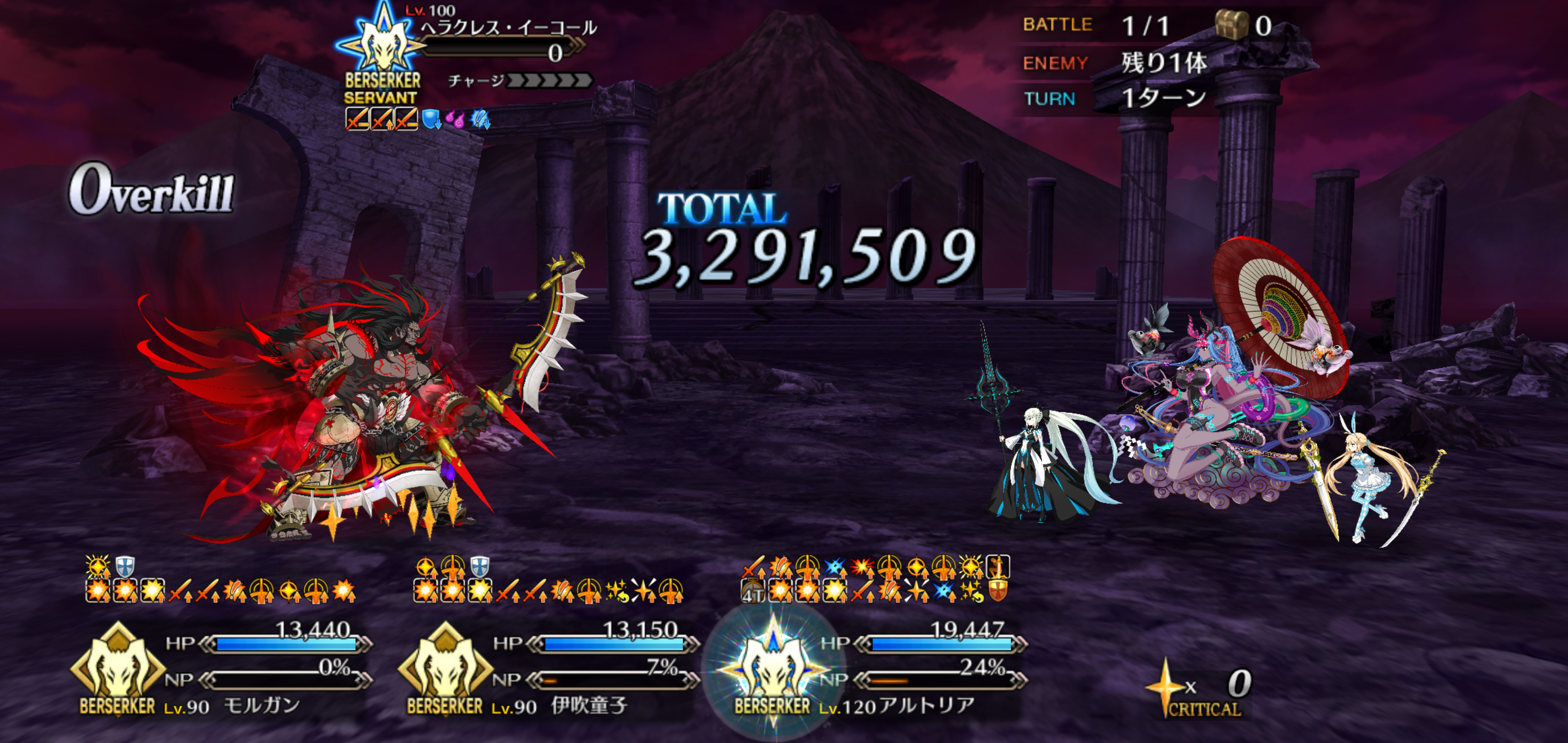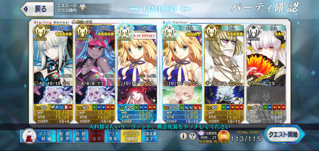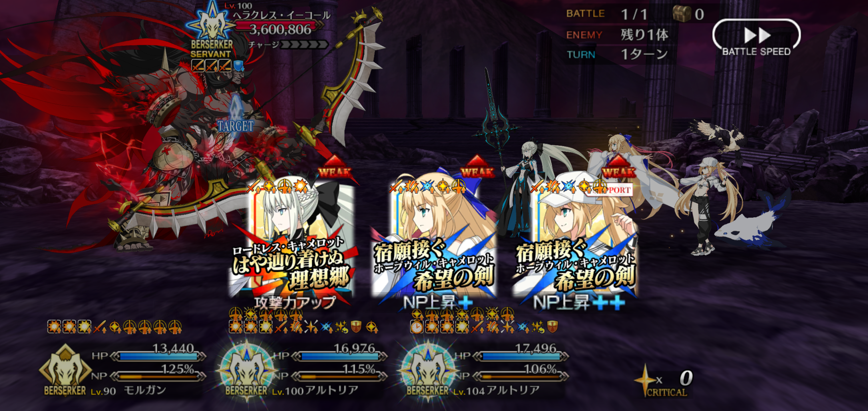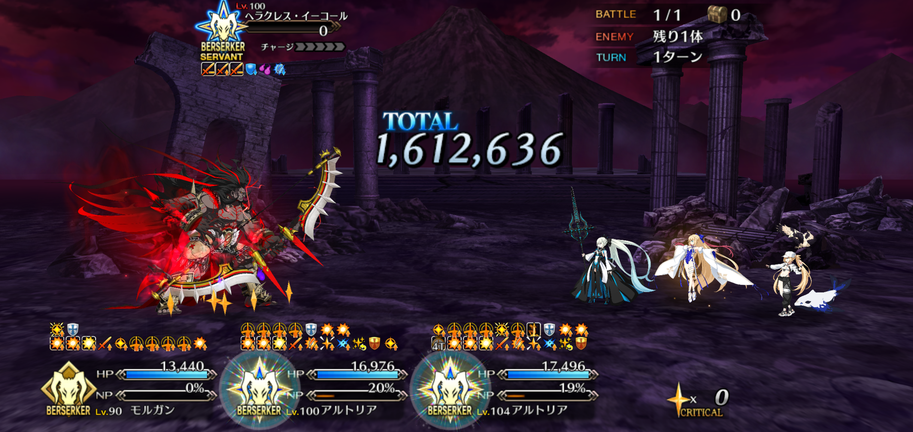 『冠位研鑽戦[バーサーカー]Ⅵ 推奨Lv.100★★』の1ターンクリア(フレンド使用)と