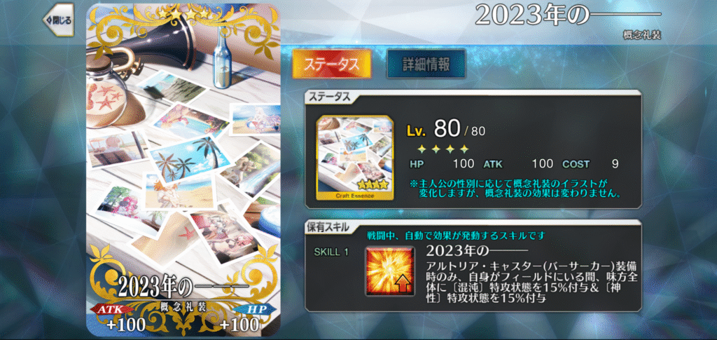 マスター礼装は新春の装いを使いましたが、下記のどちらかにするとダメージが伸びるかと思います。