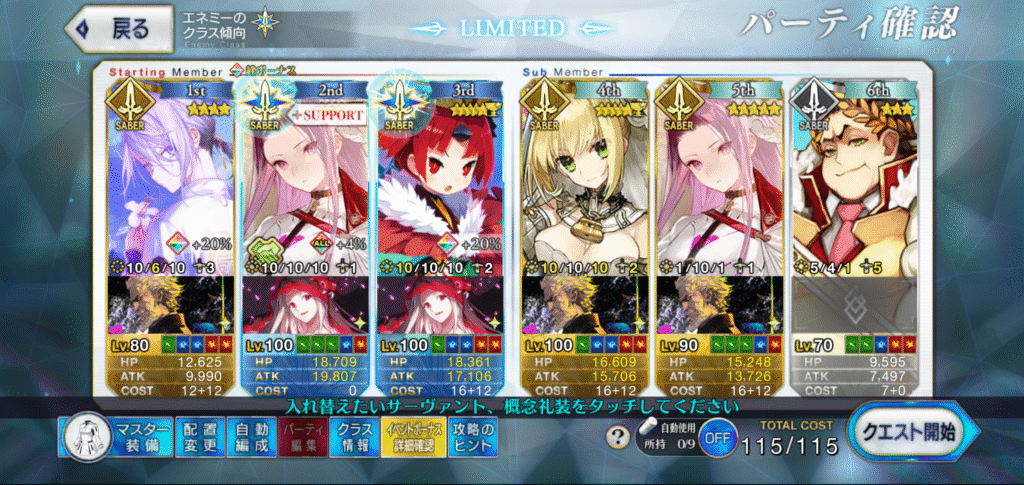 『冠位認定戦[セイバー] 推奨Lv.100★』クリア(フレンド使用)を掲載。