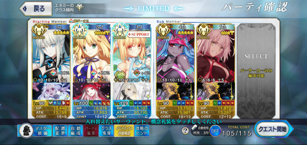 - バサトリア(自前)は、アペンドスキルNP増MAX。冠位化。宝具3。絆礼装無し。