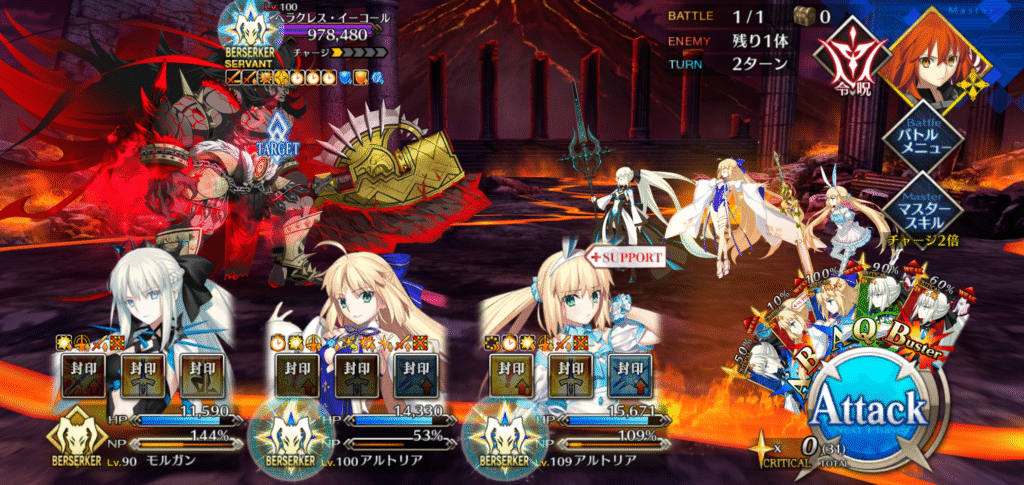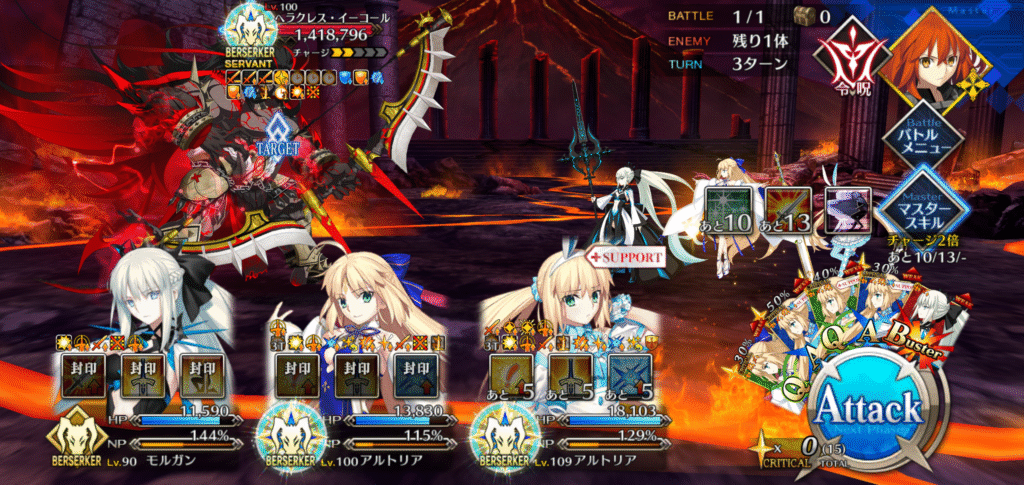 開幕に、宝具3バサトリアをスキル使用で強化、モルガンのスキル1も使用し、宝具ぶっぱ。