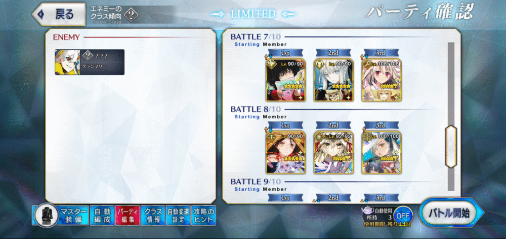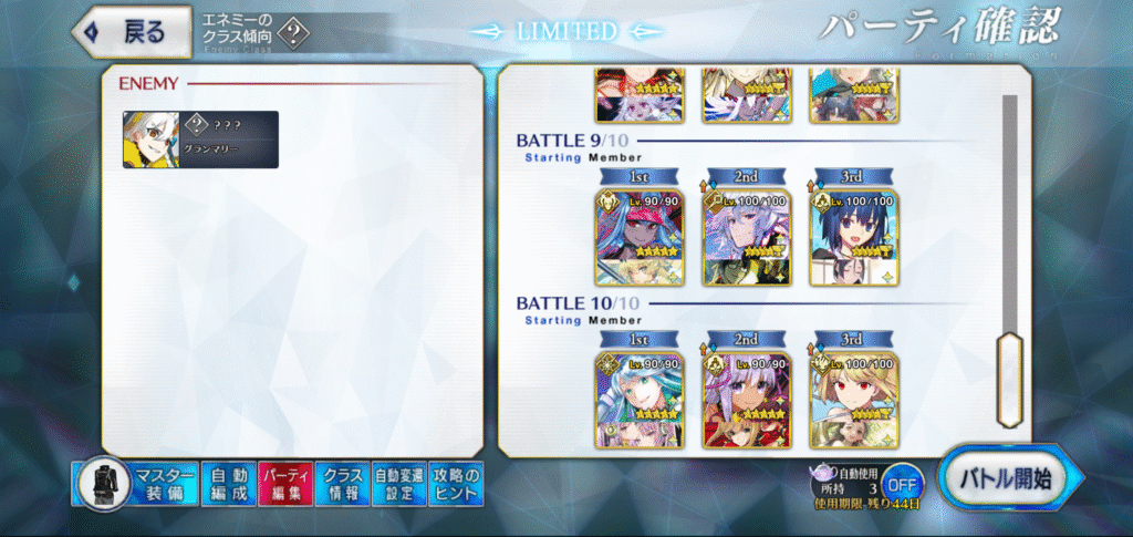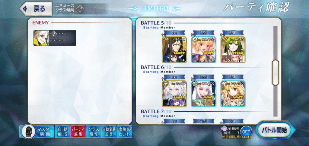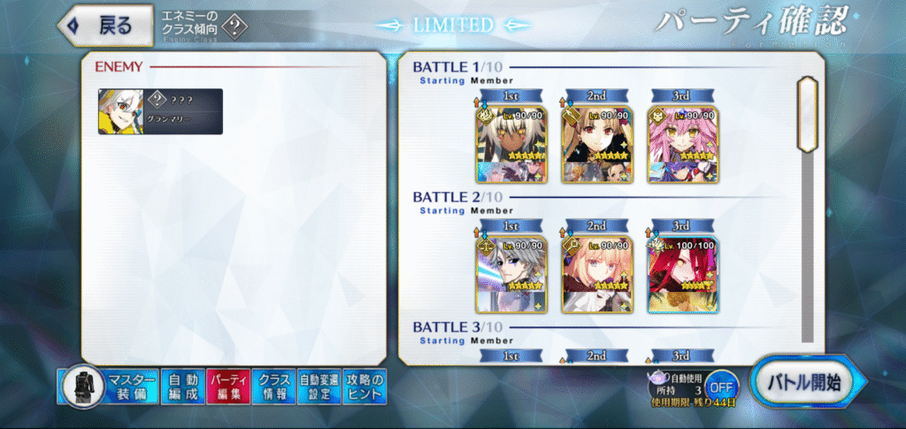 先頭がダメージを一番受けるのに防御相性を悪いのを置いたため1ターンで退場でした。オベロンが退場してモルガンが次に大ダメージを受け、もしや次の先頭に変わったから大ダメージなのか?とこの時に気づきました。(単にバーサーカーだったからかもしれませんが)