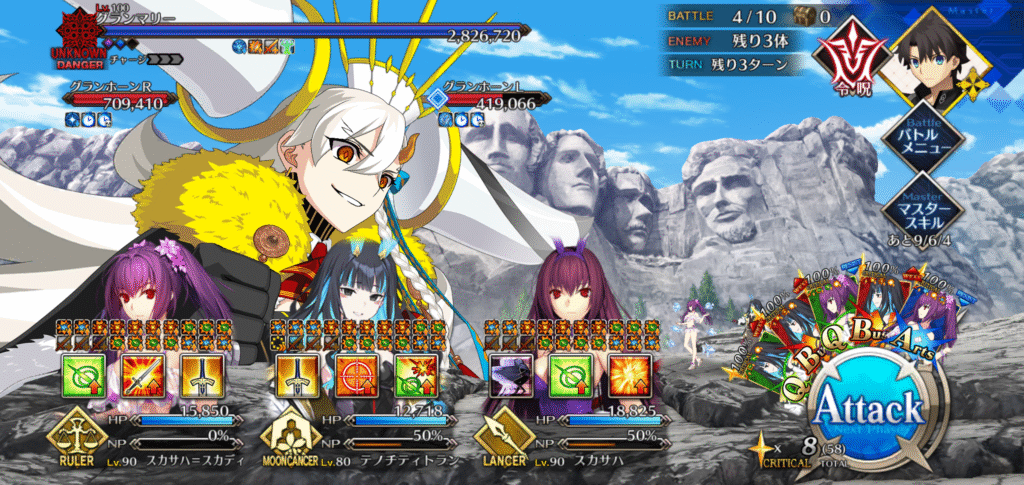 その後は、やっぱりグランホーンL,Rの順で破壊しつつ、単体宝具かクリ殴りできそうな時は本体、という感じ。