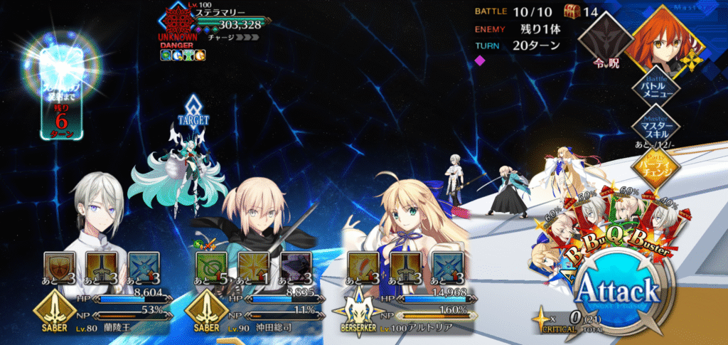 なので、3T効果のあるバフスキルを使って、そのターンは待って、次に宝具ぶっぱ。